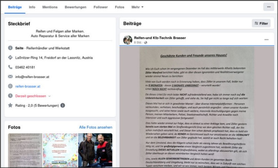 Gleichzeitg will man mich mit massenhaft Strafanzeigen mundtot machen und zu Unrecht verurteilen lassen, weil ich über die unbequeme Wahrheit berichte. Diese aktuelle Aktion des Reifenhändlers zeigt, wie verzweifelt man schon ist weil nun das baldige AUS immer näher rückt. Das was mit mir hier passiert, kann jedem anderen Brasserkunden auch jederzeit passieren, den auch ich war dort mal ein „geschätzter Kunde“. Ich bin gespannt, wie lange der Freibrief dieses insolventen Reifenhändlers noch gültig ist und was noch alles kommt. Eines ist jedenfalls sicher. Kein Unternehmer würde so eine Scheiße auf seinen Seiten veröffentlichen, wenn er nicht vorhat, sein Unternehmen direkt an die Wand zu fahren. Hoffentlich hat man sich mit dieser Aktion endgültig ins AUS geschossen, denn niemand braucht so etwas. Es gibt im Bezirk genug seriöse Werkstätten mit echten Mechanikern, die nicht ihre Kunden verleumden und denunzieren müssen, um von Pfusch & Betrug abzulenken.